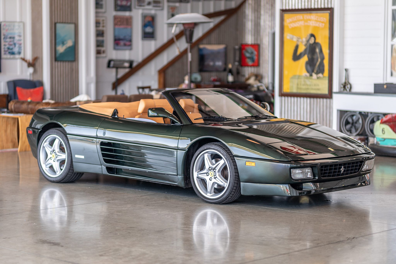 This 1995 Ferrari 348 Spider has 24k miles following a registration history in Louisiana, Florida, California, and Montana. It was specified in Verde Scuro over beige Connolly leather and powered by a 3.4-liter DOHC V8 linked with a dogleg five-speed manual transaxle and a limited-slip differential. Features include a black convertible soft top, 18″ five-spoke alloy wheels, a gated shifter, air conditioning, an Alpine CD stereo, and power windows. A timing belt service was said to have been performed in preparation for the sale, and additional maintenance included a fluids service and replacing the tires, battery, and air filters. This 348 was purchased by the seller in November 2023, and it is now offered in California with the owner’s manual, service records dating from 2009, a car cover, a tool kit, a clean Carfax report, and a clean Montana title in the seller’s name.