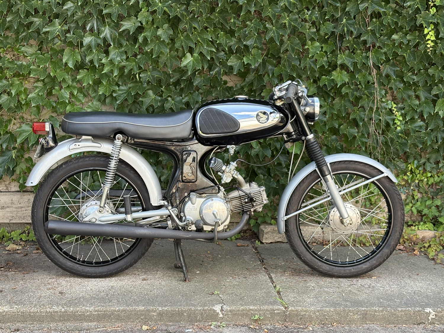 This 1966 Honda S90 was acquired as a project circa 2000 and subsequently modified and refurbished with a powder-coated black frame and silver-fenders, a replacement air-cooled 89cc four-stroke single paired with a four-speed manual transmission, a custom fuel tank, a mini clubman handlebar, switchgear, 18″ rims and stainless-steel spokes, a reverse megaphone exhaust system, Charlie’s Place electronic ignition, and more. Additional equipment includes a two-up seat, a kick starter, a heel/toe shifter, a 6-volt lithium battery, chrome fuel tank panels, and a center stand. This S90 is now offered at no reserve with a helmet, goggles, an owner’s manual, a microfiche parts list, a spare tank badge, keys, and a clean Minnesota title in the seller’s name.
