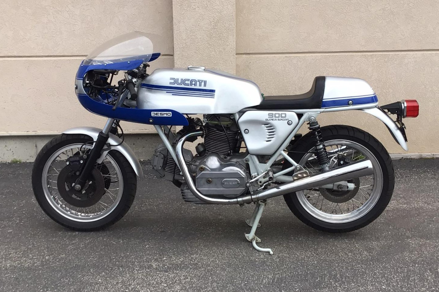 This 1977 Ducati 900SS spent time in Texas before it was acquired by the selling dealer in 2019, and its air-cooled 864cc square-case L-twin underwent a rebuild at Salt City Builds of South Salt Lake, Utah, in November 2024. Work at that time included replacing the bevel gear cover, valve shims, carburetor boot clamps, piston rings, and carburetor jets in addition to installing an Elektronik Sachse ignition kit, coils, and wires. Additionally, a case saver was fitted, the speedometer drive gear was rebuilt, the rear brake caliper was serviced, the clutch rod bearing and spacer were replaced, and the steering stops were adjusted. Finished in silver with blue accents, the bike is equipped with a half fairing, a rear cowl, a racing-style seat, Borrani alloy rims, a Marzocchi fork, triple disc brakes with Brembo calipers, and a steering damper along with a desmodromic valvetrain, Dell’Orto PHM carburetors, a five-speed transmission, and a chrome dual exhaust system with upswept Conti megaphone mufflers. Previously offered by the selling dealer on BaT in April 2025, this 900SS is offered again at no reserve in Idaho with service records and a bonded Texas title.