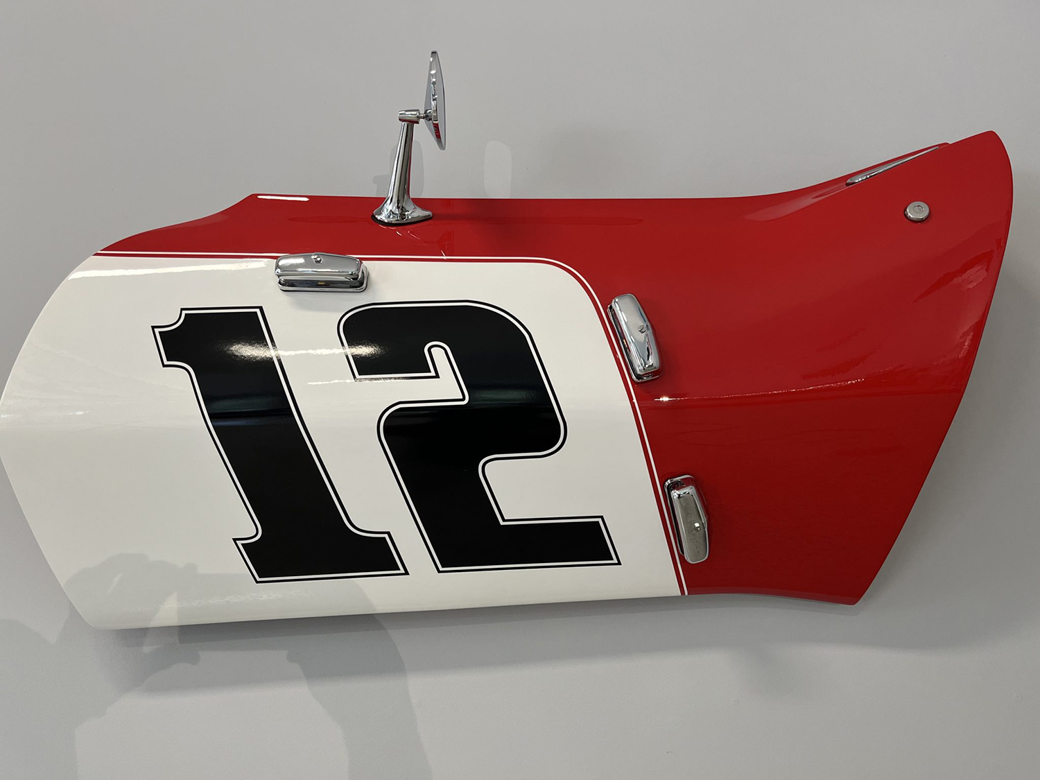 This door panel was sourced from a Chevrolet C3 Corvette and refinished by the seller in 2024 in the style of the 1968 Owens-Corning L88 race car. The door is painted red and white. Additional details include black vinyl #12 decals, a side mirror, a door handle, and three illuminated lights. This wall art is now offered at no reserve in Jefferson, Georgia.